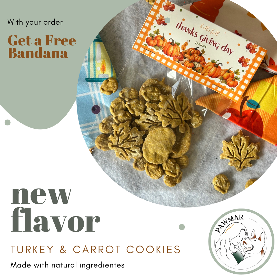 Ricas y nutritivas galletas de pavo y zanahoria. Echas con productos 100% naturales. Bandana GRATIS con la compra.